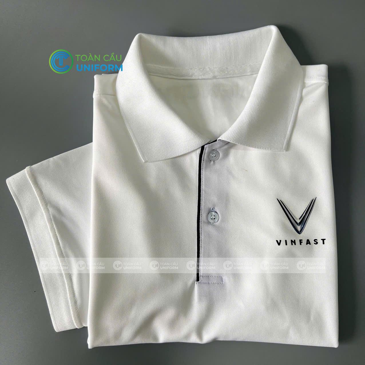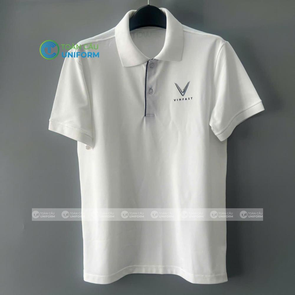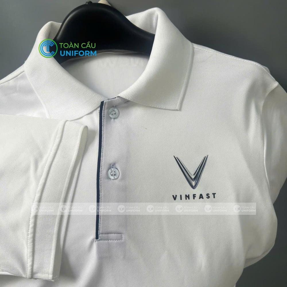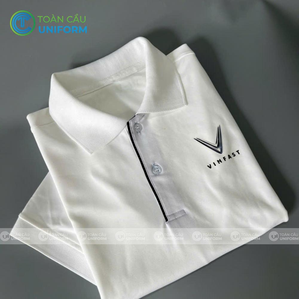 Mẫu áo thun đồng phục cổ trụ VinFast màu trắng được thiết kế theo phong cách tối giản hiện đại – xu hướng được nhiều doanh nghiệp lớn lựa chọn để thể hiện sự chuyên nghiệp và đẳng cấp thương hiệu.